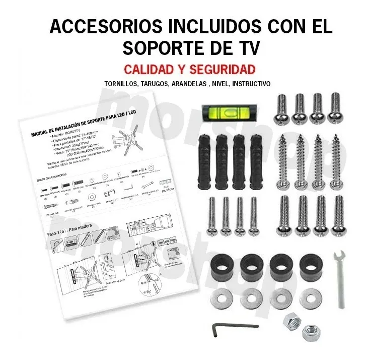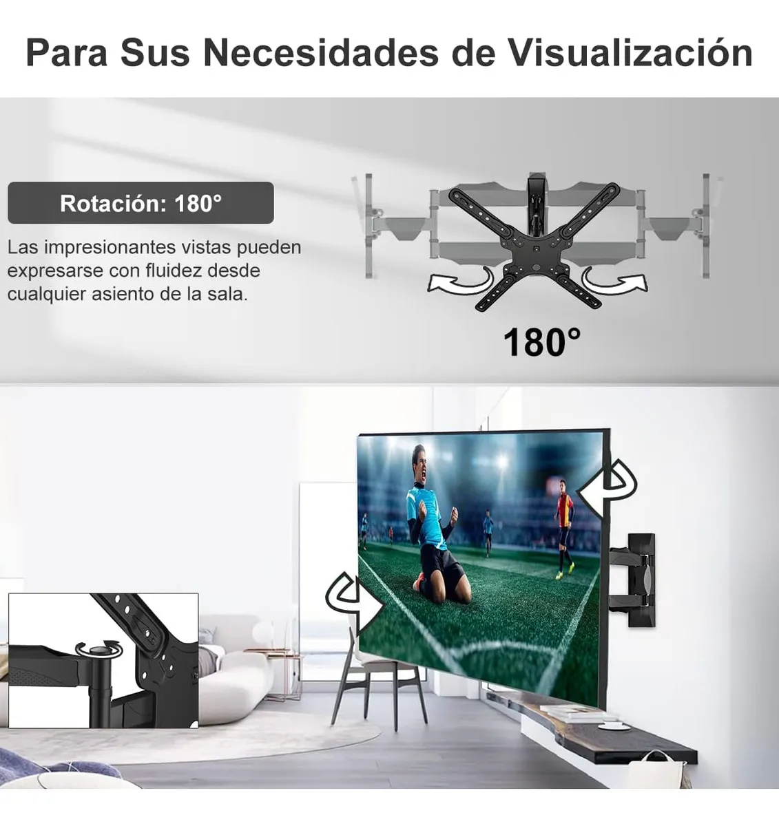 - Ajustable: Permite ajustar el televisor para una visualización óptima, adaptándose a diferentes entornos y necesidades, con una rotación de 180° e inclinacion de -15 y +15.